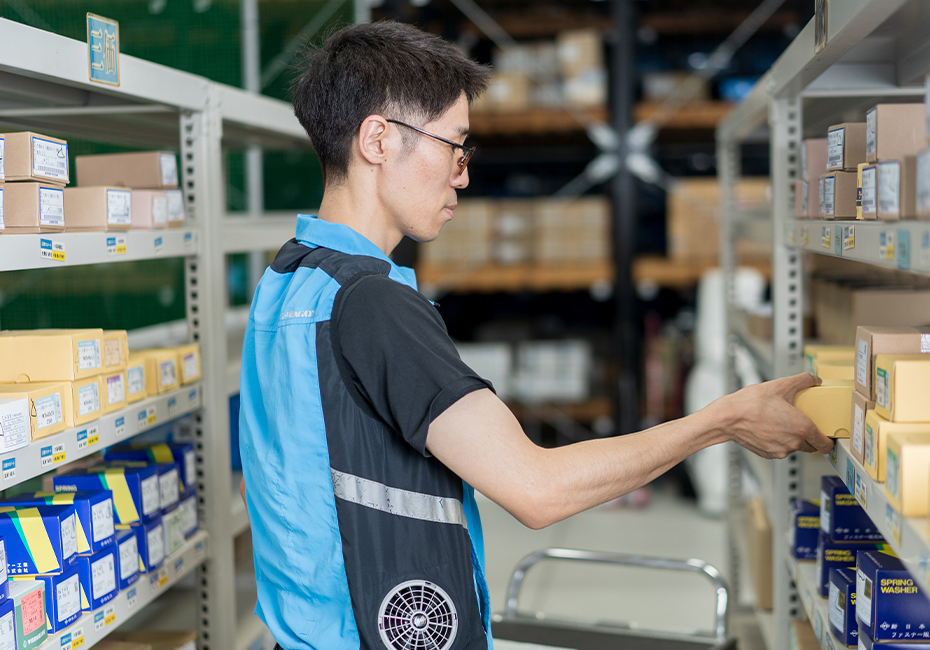 入社当初は倉庫の広さに圧倒され、商品がどこにあるのか分からず戸惑うこともありました。しかし、充実した研修や先輩方の丁寧なサポートのお陰で、少しずつ知識や感覚が身に付き、今では自信をもって作業に取り組めるようになりました。また、ねじについても、社内の勉強会に参加したり、営業担当者に質問したりしながら理解を深めています。実際の現場の話を聞くなかで、「これほど重要な所で使われているのか」と驚くこともあり、さらに丁寧な作業を意識するようになりました。商品管理の仕事では、細やかな確認や、他のスタッフと協力する姿勢、状況に応じて工夫する柔軟さが欠かせません。私自身もそうした姿勢を大切にしながら、これからも学びを続けることで、会社やお客様に貢献し続けたいと考えています。
